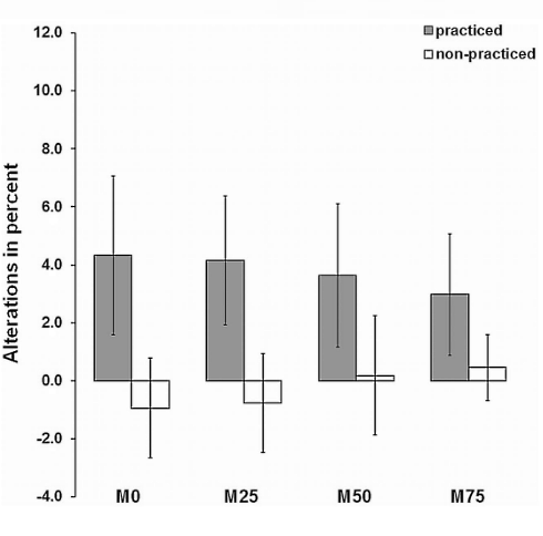 The M25 group replaced 25 percent of the physical training sessions with mental ones, during which they just imagined that they were training. The M50 group replaced 50 percent of the physical training sessions and the M75 group, 75 percent of the physical training sessions.