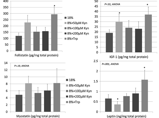 The enzyme-linked immunosorbent assays the scientists conducted show significant increases in skeletal muscle insulin-like growth factor-1, leptin, and the myostatin antagonist follistatin with Trp supplementation. The corresponding mRNA microarray and gene pathway analysis that were performed on muscle samples of the rodents demonstrate that the pro-anabolic mTor/eif4/p70s6k pathway molecules were significantly upregulated in muscles from mice on Kyn and Trp supplementation. Increases in myoprogenitor cell activity, were yet only seen with tryptophan (not shown in Figure 2). Its metabolite kynurenine, however, didn’t have any effect on MyoD, myogenin & myosin heavy chain.